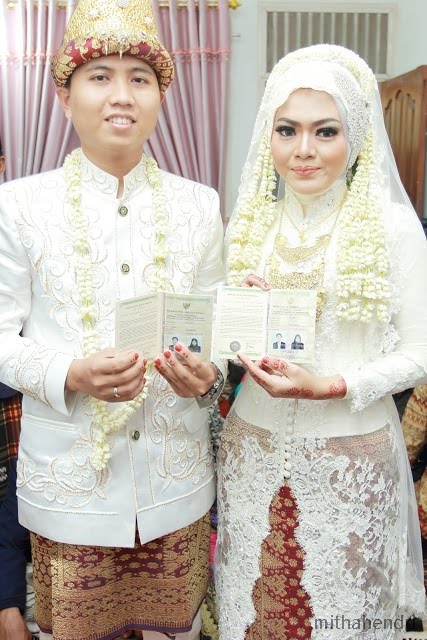 Dari awal memutuskan menikah saya tetep kekeuh ga mau jahit beskap akad nikah suami. Nikah kan cuma sekali kan ? kan ? lagi pula adek-adek kami belum tentu mau nikah pake beskap kakak nya. Jadi saya minta bantuan tante Muji untuk siapin beskap warna broken white yang simple dan masuk ke badan suamiku. Sekitar bulan mei, kami fitting Beskap resepsi dan akad, dan wow ! passss banget..Sedangkan untuk kepala, suamiku pake tanjak Palembang yang juga disewa dari Tim Istana Alamanda.
