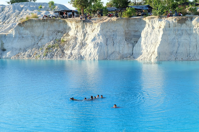 Untuk menikmati birunya danau ini, kalian ga perlu mengeluarkan biaya sepeserpun baik karcis ataupun parkir. Karena emang sebenarnya danau ini adalah kolong bekas penambangan. Walaupun cantik sekali dilihat dari dekat, tapi akan sangat miris kalo dilihat dari udara. Nanti kalo kalian main ke Bangka, saat mau mendarat coba liat ke bawah. Banyak banget kolong-kolong sisa penambangan yang tersebar seantero pulau. Miris banget. Makanya banyak yang menanggap ini bukan danau, tapi kolong yang terlihat seperti surga dari bawah, tapi seperti neraka dari udara.